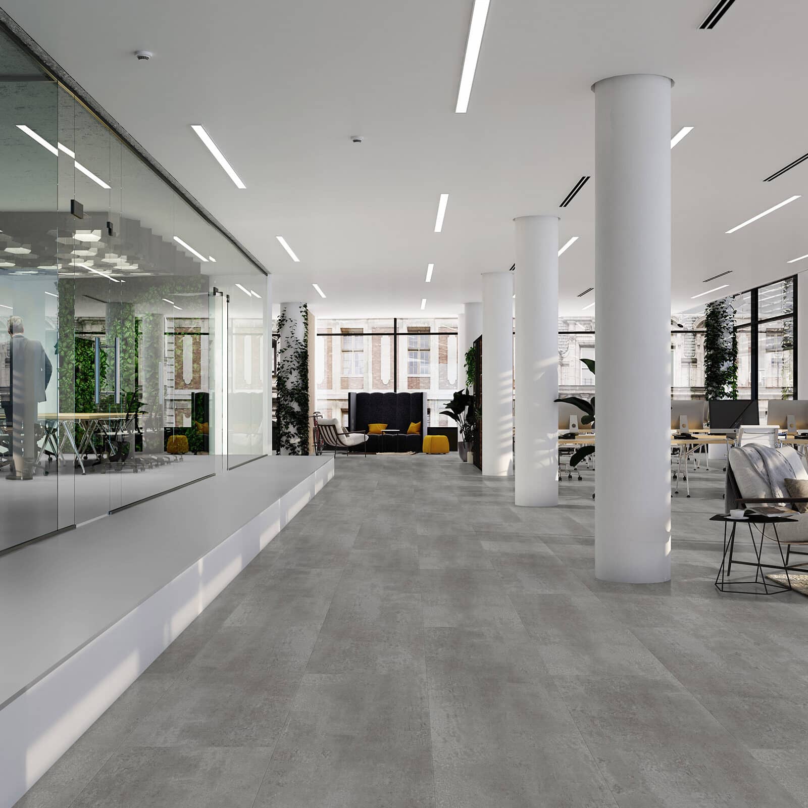 Vivafloors Tegel 1710 is een donkere betonlook tegel. Robuust en stoer! De tegels uit deze serie zijn door de verschillende grijstinten en gekleurde velling perfect voor een industrieel interieur.
