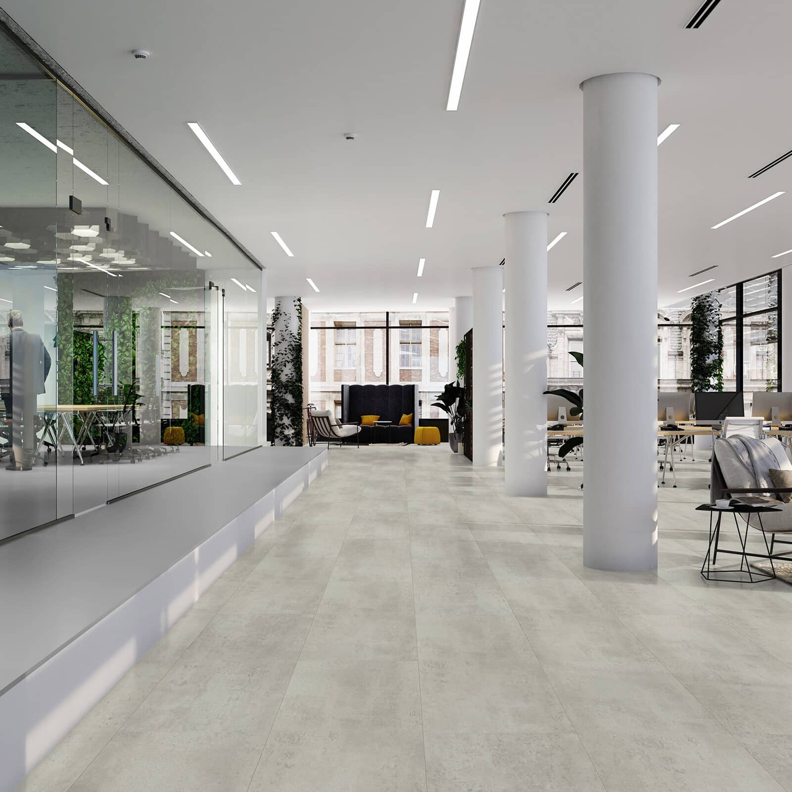 Vivafloors Tegel 1720 is een lichte betonlook tegel. Modern en industrieel! De tegels uit deze serie zijn door de verschillende grijstinten en gekleurde velling perfect voor een industrieel interieur.
